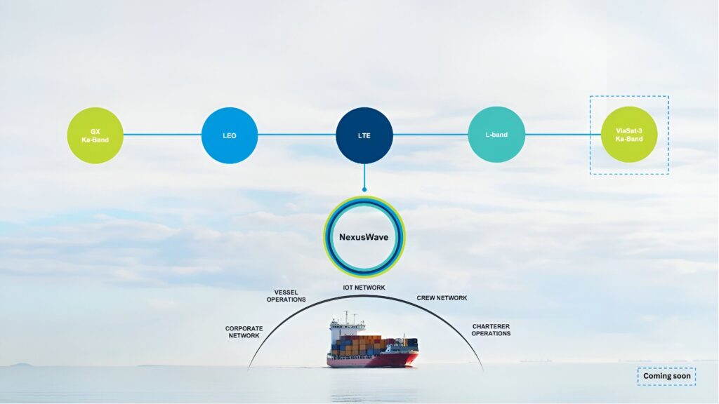 NexusWave ofrece conectividad rápida y permanente mediante la integración perfecta de múltiples redes de alta velocidad en tiempo real (banda Ka Global Xpress (GX), servicios de órbita terrestre baja (LEO) y servicio LTE costero según disponibilidad) con una capa adicional de banda L para mayor resiliencia.
